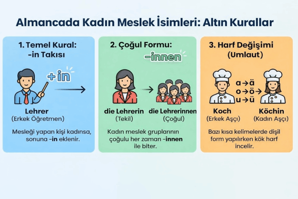 Meslekler konusu Almanca’da dilbilgisi olarak kelimelerin cinsiyetinin en sık görüldüğü alandır. Bu noktada bir mesleği erkek icra ediyorsa farklı, kadın icra ediyorsa farklı kelime kullanılır. Ayrıca önceki konularda öğrendiğimiz bazı bilgilerden de yararlanacağız meslekleri öğrenirken. Örneğin meslek sorma ve cevaplama kısmında kişi zamirleri yani Personalpronomen konusunda öğrendiğimiz bilgilerden yararlanırken yazılı veya sözel olarak kendimizi tanıtma, gelecekteki planlarımızdan bahsederken de yazma becerilerimizden faydalanacağız.