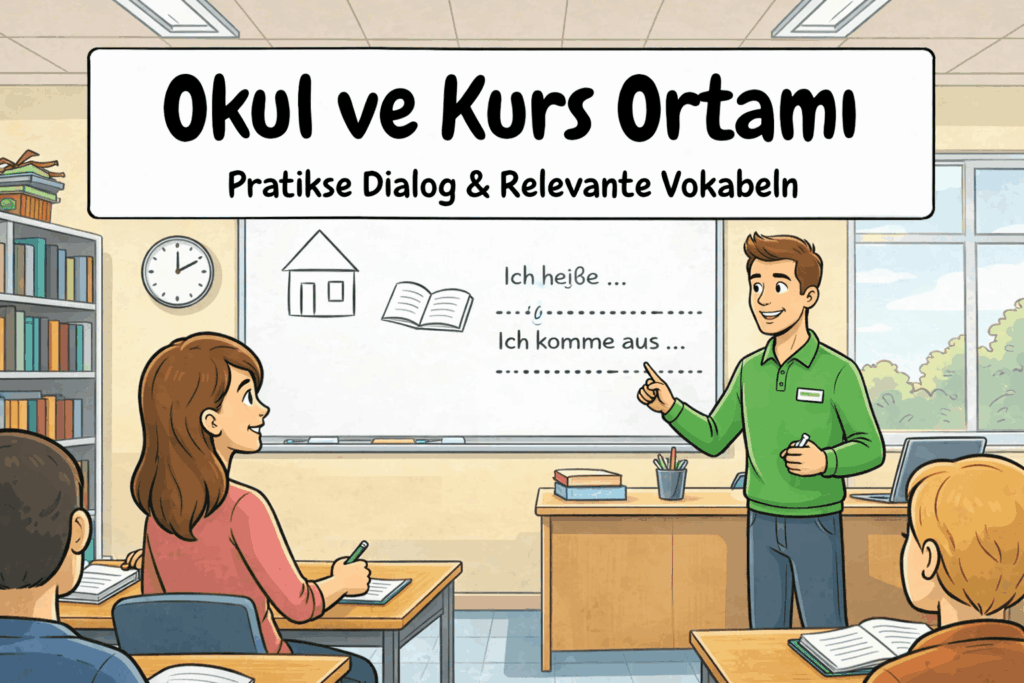 Almanya’da günlük hayat kategorimizde bugün okul ve kurs ortamı konusuna değineceğiz. Profesyonel gelişim ve etkili iletişim için oldukça önemli olan bu konuda okul ve kurs ortamlarında kullanılan kelimeler, ve geçebilecek diyaloglar ile konuyu daha akıcı aynı zamanda kalıcı hale getireceğiz.